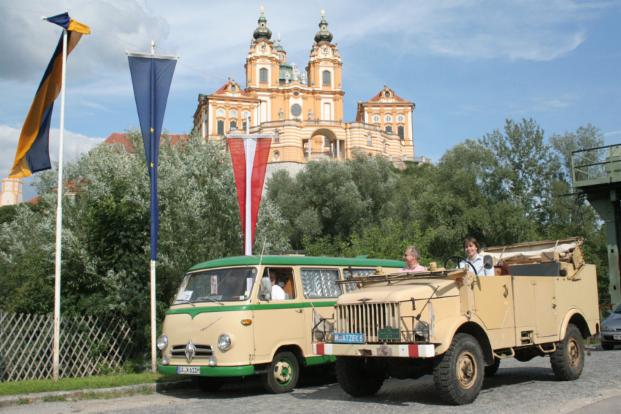 B2000 Kübelwagen und B611 Bus vor dem Stift Melk an der Donau