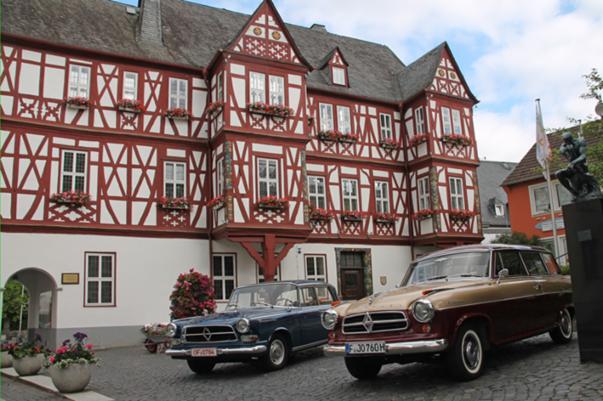 Wer diesen Parkplatz vor dem Rathaus in Nassau nutzen möchte muss mit einem Borgward kommen.