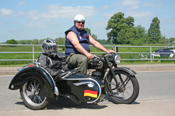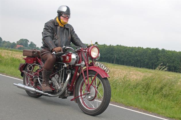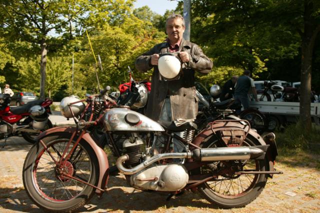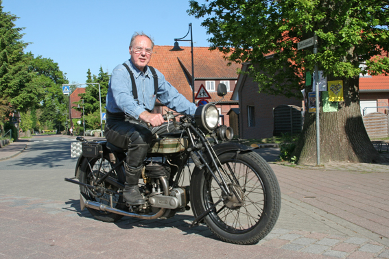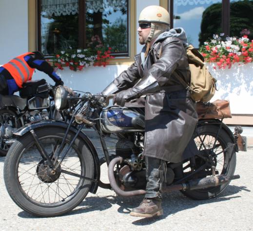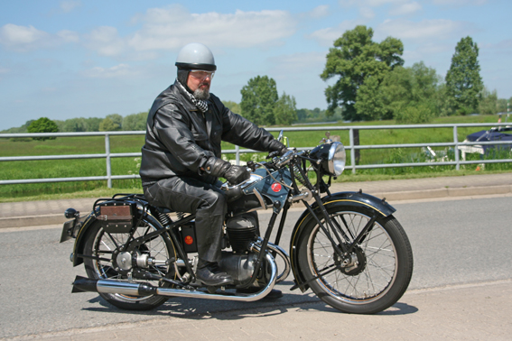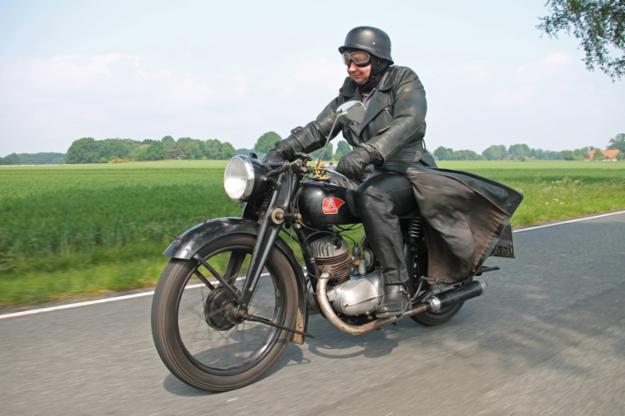 Stilecht gekleideter Fahrer auf einer unrestaurierten Noris 200 von 1933