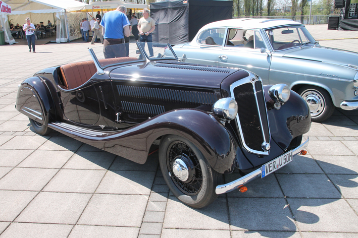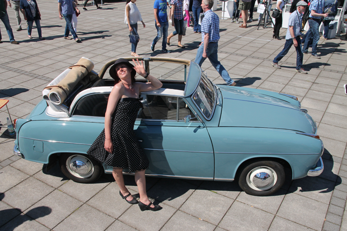 Der Goliath 900 Cabrio-Limousine gehört nicht zum Fuhrpark der stilecht gekleideten Borgwardfreundin.