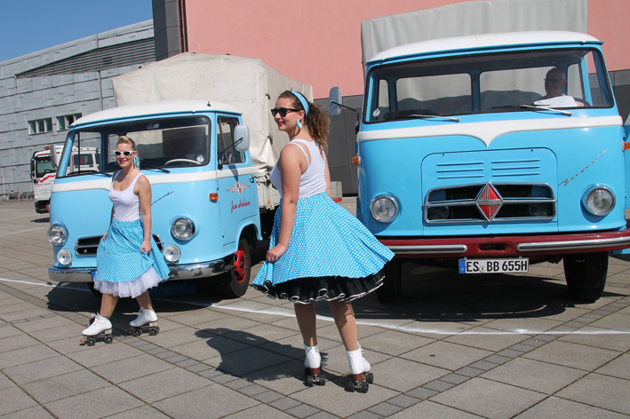Farblich angepaßt sind die Rollschuhmädels an die beiden Frontlenker-LKW.